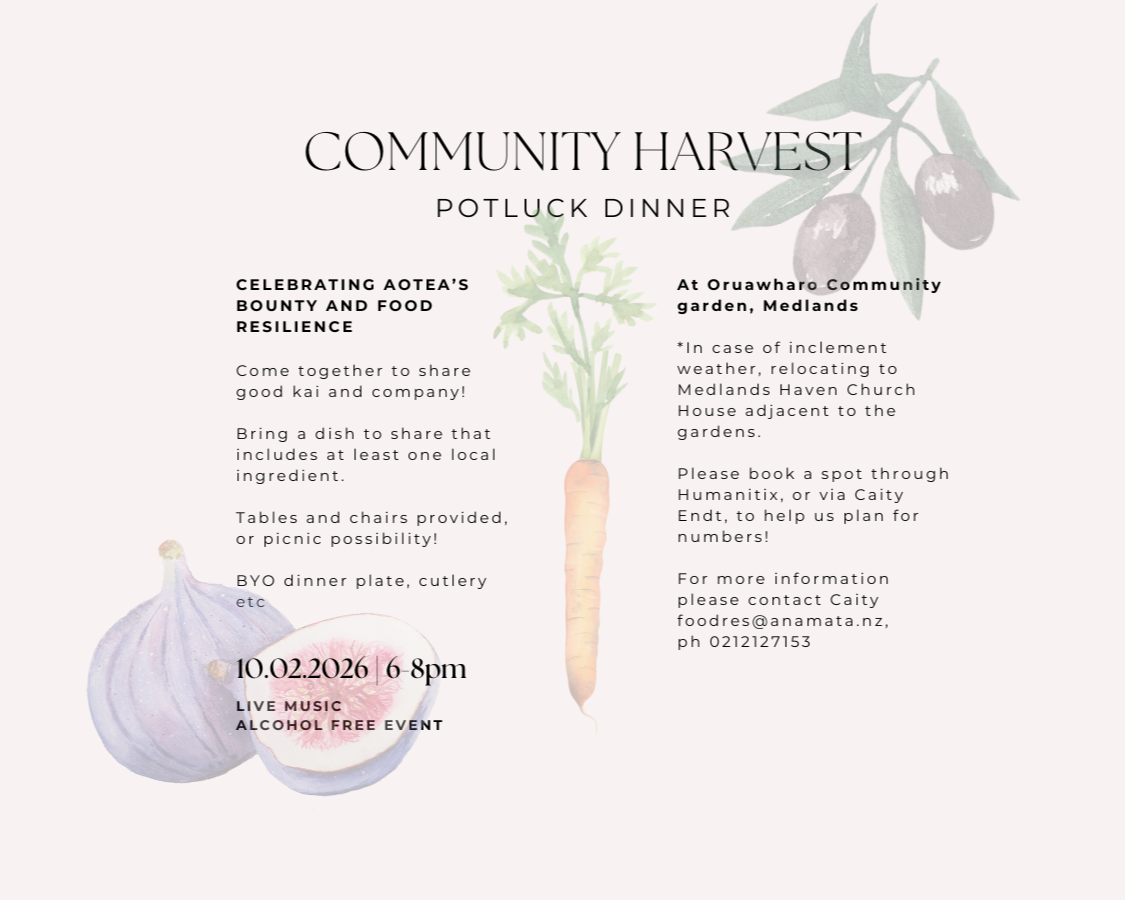 To help with planning, please book via Humanitix https://events.humanitix.com/community-harvest-potluck-feast or txt/ph Caity 0212127153 or email foodres@anamata.nz